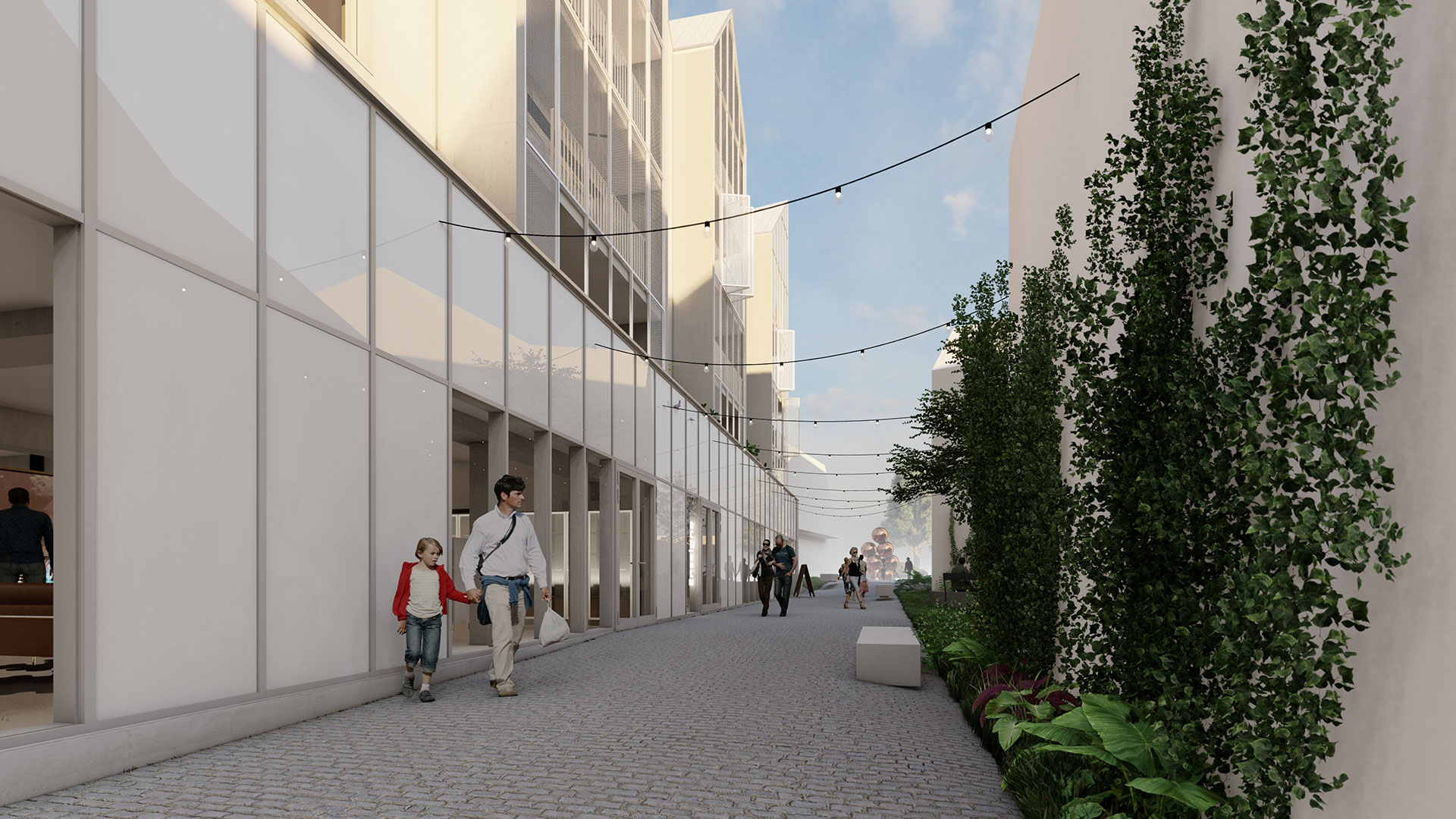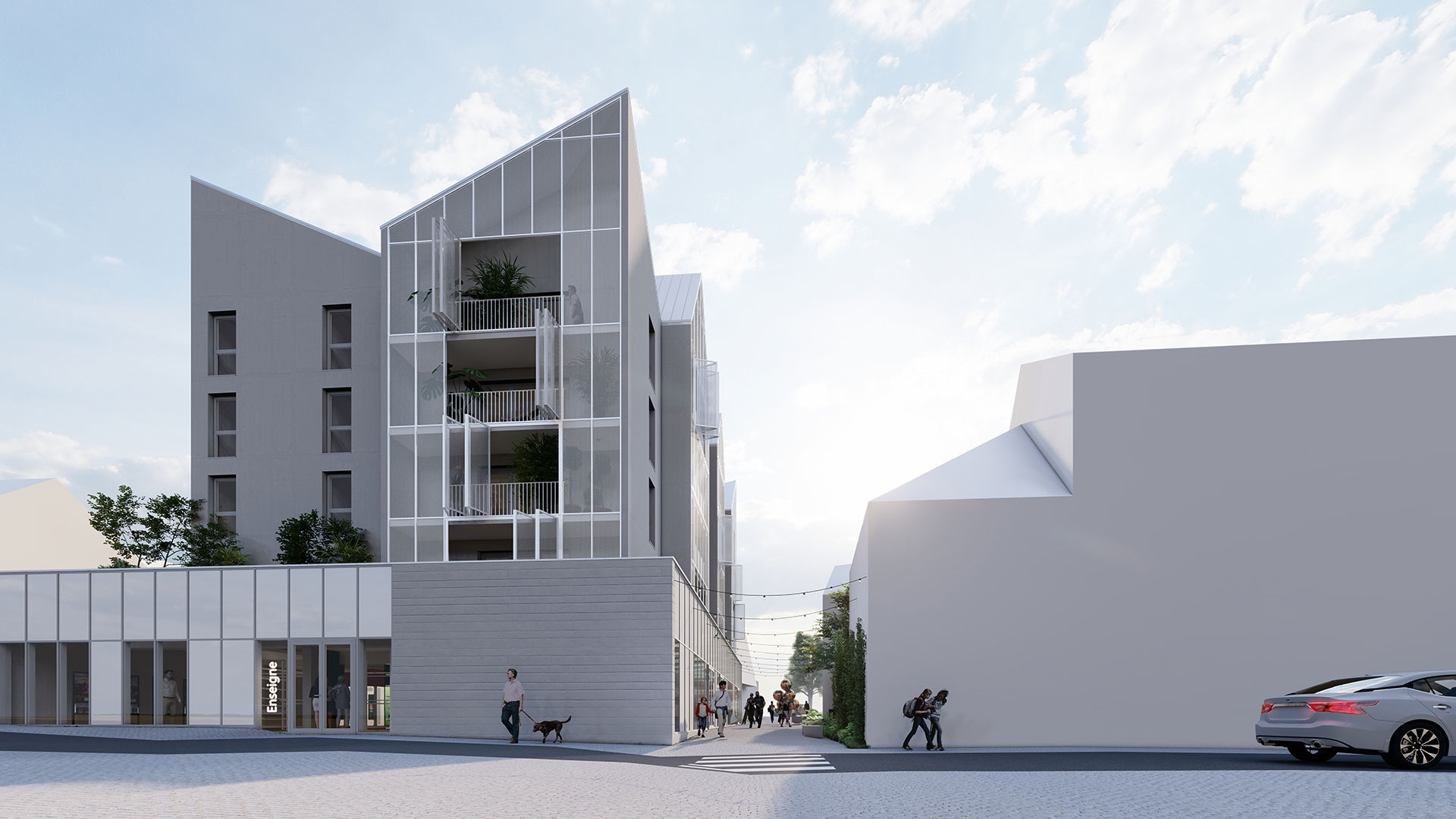 Le rez-de-chaussée est dédié à l’accueil de commerces sur une surface de près de 500 m² divisibles. Dotés de larges vitrines, ces espaces viennent en front de rue et sont directement accessibles depuis 3 façades : rue de Moncontour, rue des Combattants et par la venelle piétonne qui relie ces deux rues. Une quatrième entrée sera réservée aux résidents pour un accès plus confidentiel.