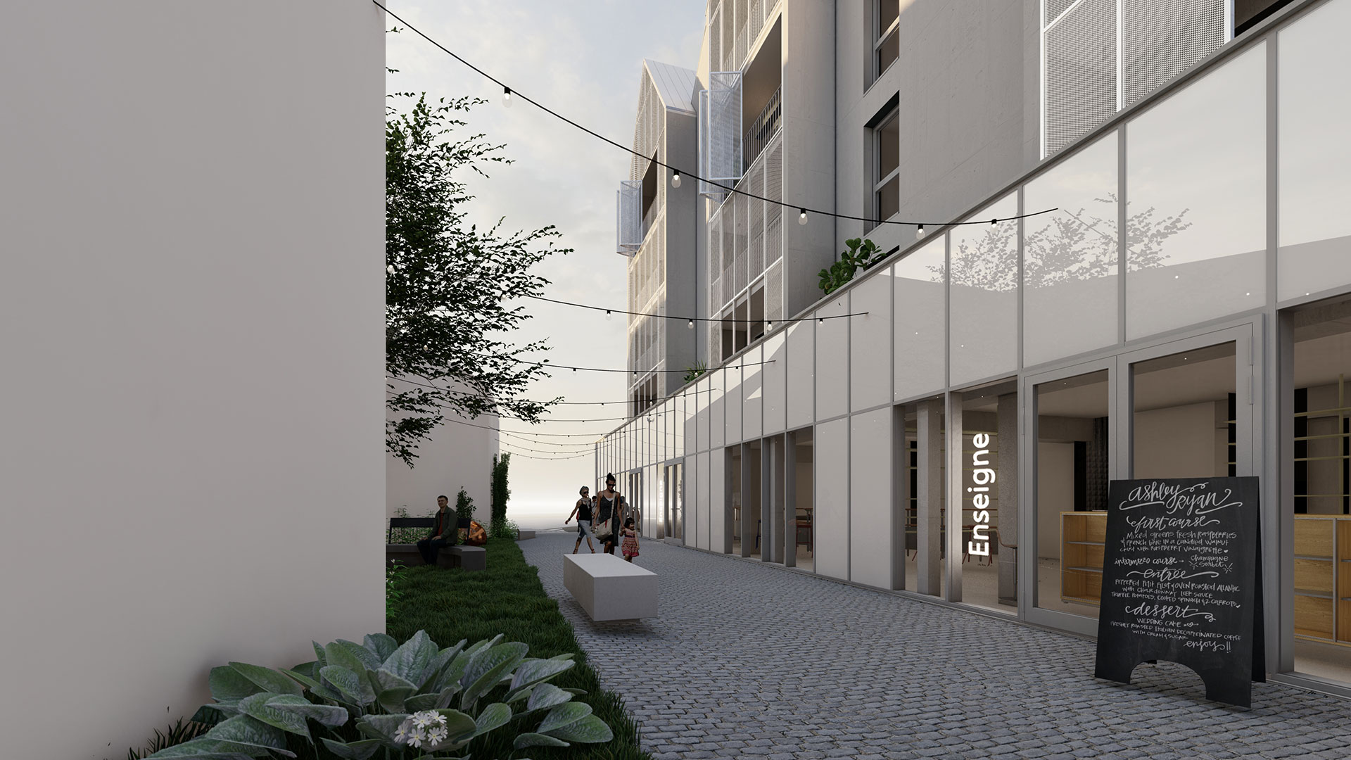 Le rez-de-chaussée est dédié à l’accueil de commerces sur une surface de près de 500 m² divisibles. Dotés de larges vitrines, ces espaces viennent en front de rue et sont directement accessibles depuis 3 façades : rue de Moncontour, rue des Combattants et par la venelle piétonne qui relie ces deux rues. Une quatrième entrée sera réservée aux résidents pour un accès plus confidentiel.